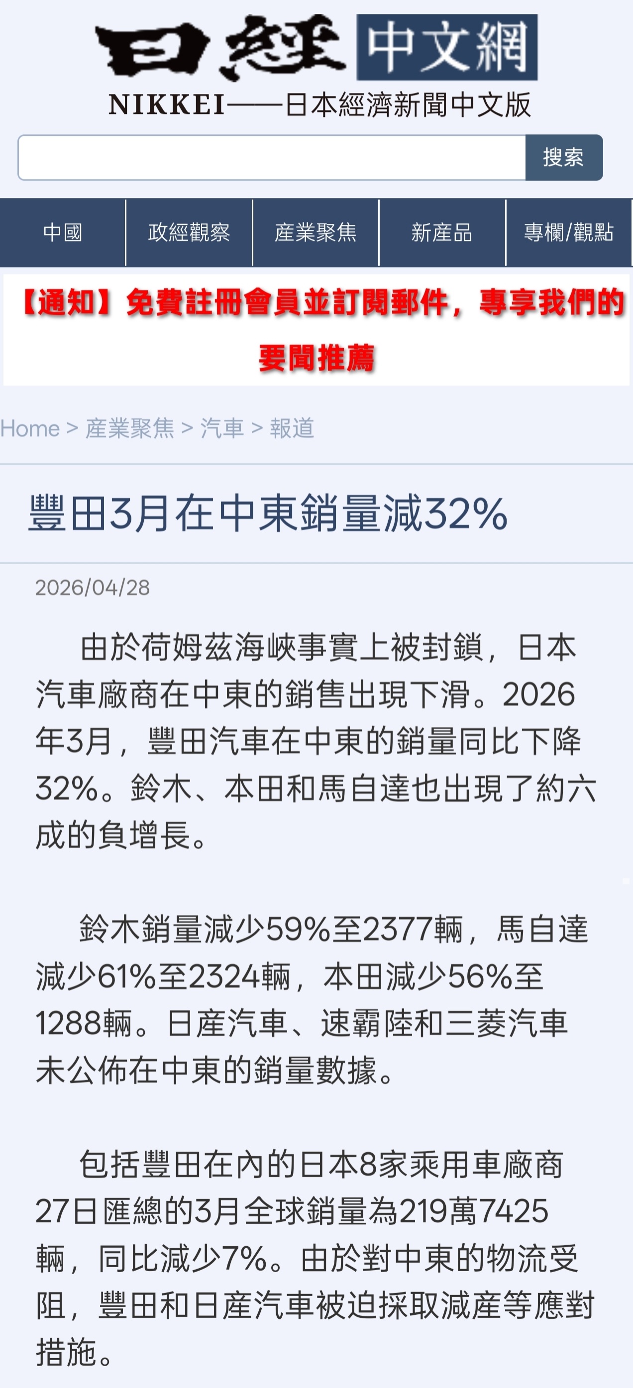 因为霍尔木兹海峡封锁,日系车在中东的销量暴跌,其中丰田下跌32%,铃木、本田、马自达,下跌更多约六成