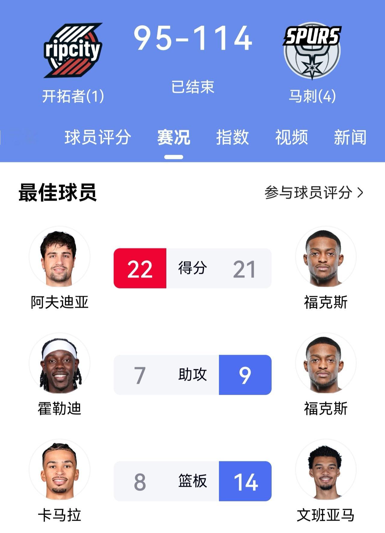 全场数据方面,马刺核心福克斯砍下21分3篮板9助攻,用得分与串联撑起全队进攻;文班亚马延续统治级防守表现,全场拿到17分14篮板6盖帽的豪华数据,用护框能力彻底锁死开拓者内线;尚帕尼贡献19分7篮板,哈珀、卡斯尔分别得到17分、15分。开拓者方面,阿夫迪亚空砍22分3篮板3助攻,格兰特仅得到12分,罗威、西索科分别拿到11分,全队没能形成有效的进攻火力,最终遗憾止步季后赛首轮。