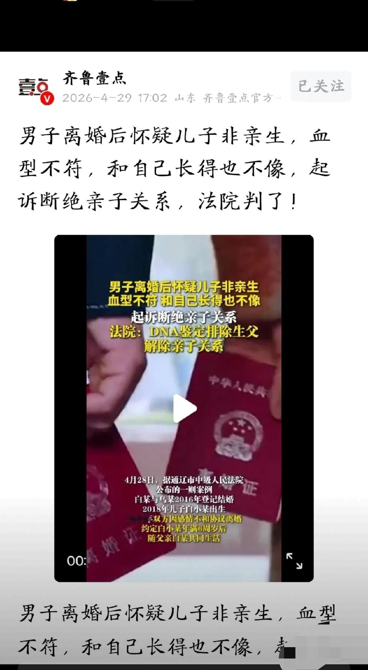 内蒙古通辽,男子和妻子结婚第三年,因感情不合离婚,一岁的儿子跟母亲生活,但双方约定,等孩子长到6岁,就回到父亲身边。男子满心欢喜等到儿子6岁,谁知,他竟发现,儿子的眉眼和神态一点也不像自己,最让他崩溃的是,血型也和自己不符。掏心掏肺这么多年,竟然在给别人养孩子,男子感觉自己就像个笑话,他实在咽不下这口气,告上法庭,要求否认这段亲子关系。
