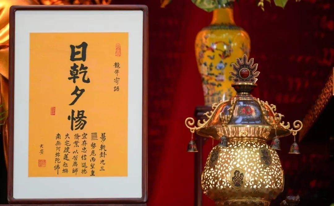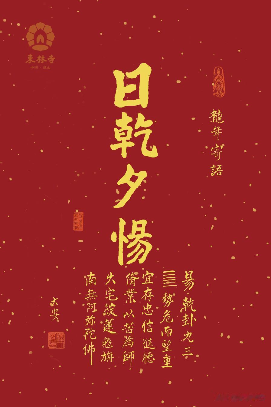 今天给大家讲一下龙年题词的意思。每年东林寺都会针对这一年的特点写一句话或者一个词,龙年写的是“日乾夕惕”。为什么会选这四个字?这是《周易》里面的乾卦,乾卦六爻都是纯阳,而且从初爻到六爻都是用龙来比喻,这里就涉及到我们中华文化的一个重要的标志——龙文化。