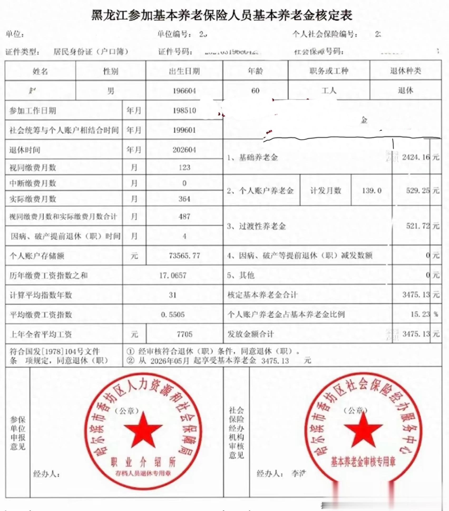 这位友友是一名黑龙江省退休人员。4月份退休还没有拿到养老金。但养老金核定表已经拿到了。不知道这位友友对自己的养老金是否满意?
