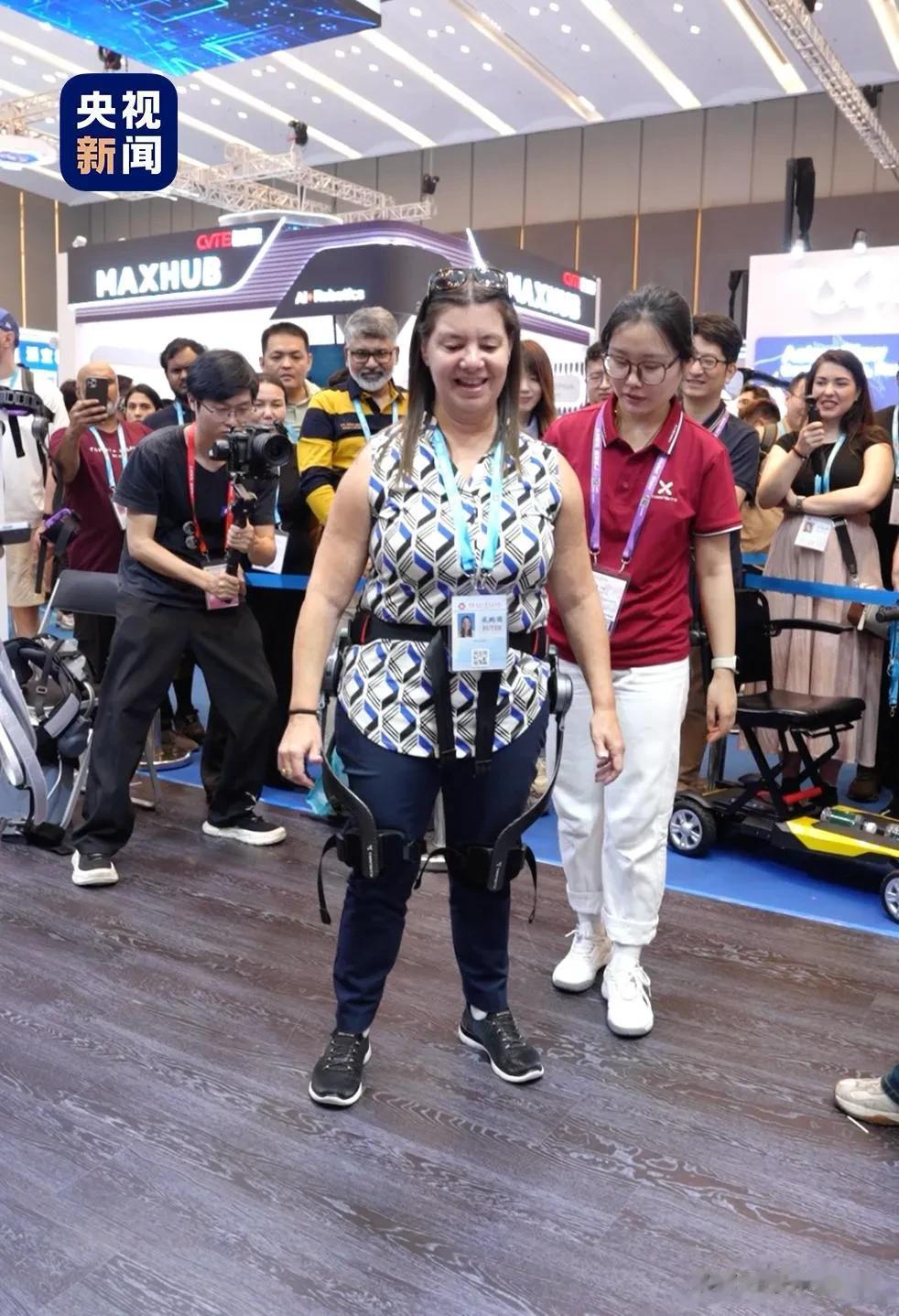 短暂适应平衡后,她试探着抬起脚,迈出了第一步、第二步……从起初的小心翼翼、需要旁人轻扶,到后来逐渐松开双手,稳稳地在展位前独立行走,甚至还从容地转了两圈。每一步都平稳而坚定,每一步都打破了长久以来的身体局限。