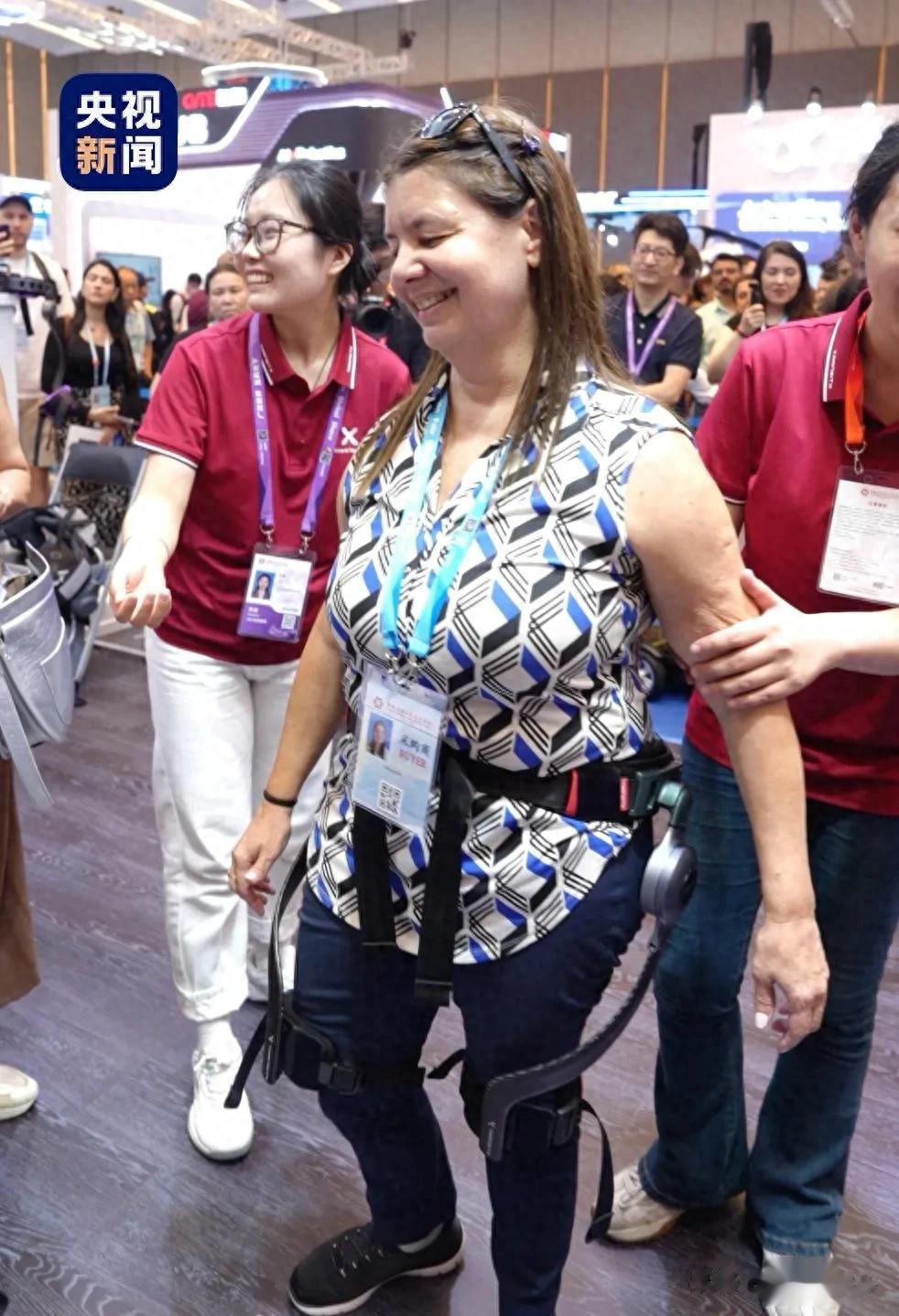 “她站起来了!她真的走起来了!”现场瞬间爆发出雷鸣般的掌声与欢呼。一旁陪同的亲友(疑似Maria的姐姐),看着这难以置信的一幕,激动得热泪盈眶,一边抹着眼泪,一边不停竖起大拇指,为中国科技、为Maria的勇敢尝试点赞。工作人员也纷纷红了眼眶,递上纸巾,上前拥抱安慰。