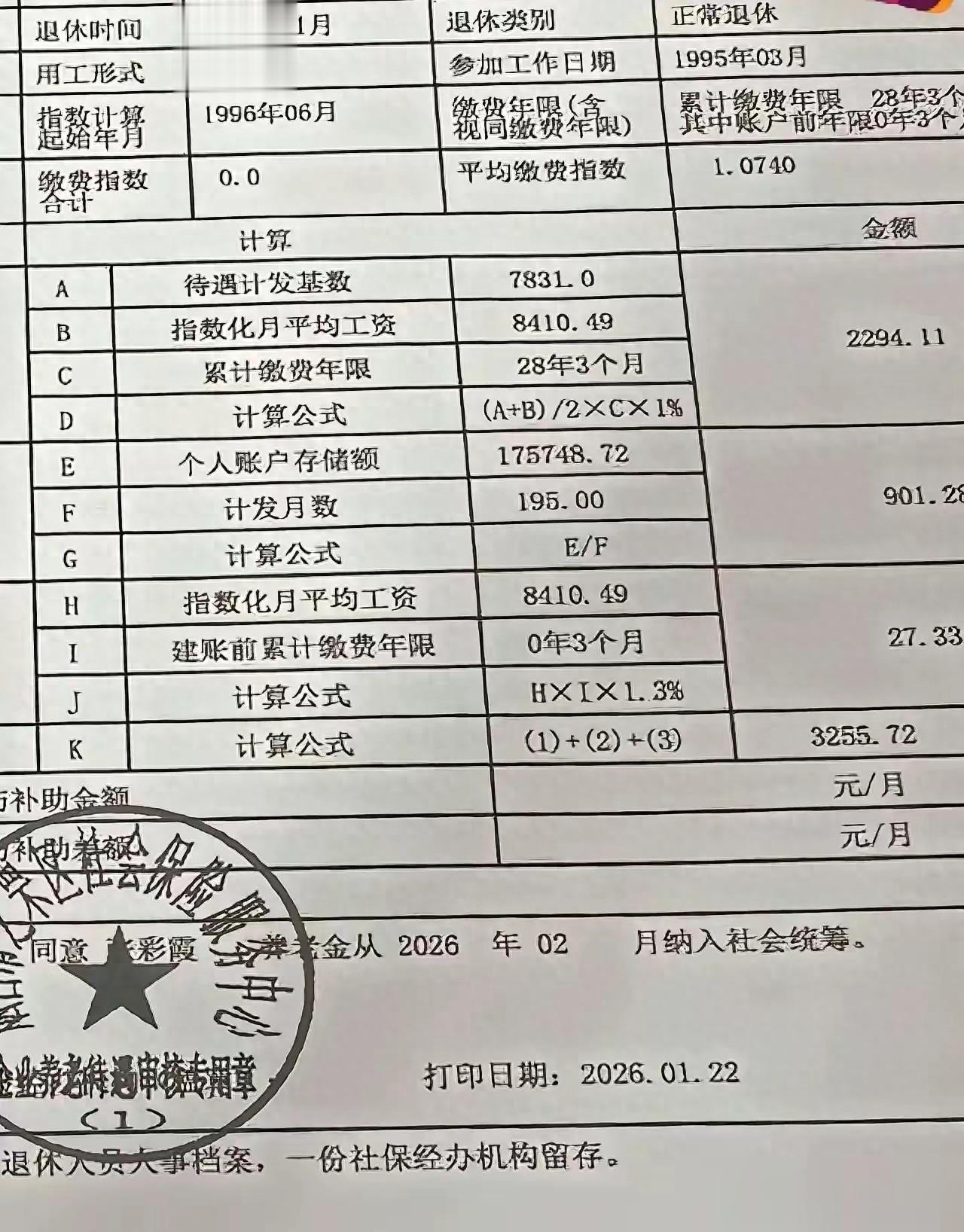 这是一张山东退休人员养老金核定表。这位友友95年3月参加工作,指数计算起始年月是96年6月,2026年1月退休,累计缴费年限达到了28.25年,其中建账前缴费年限只有3个月。这个年限越短过渡性养老金越少。