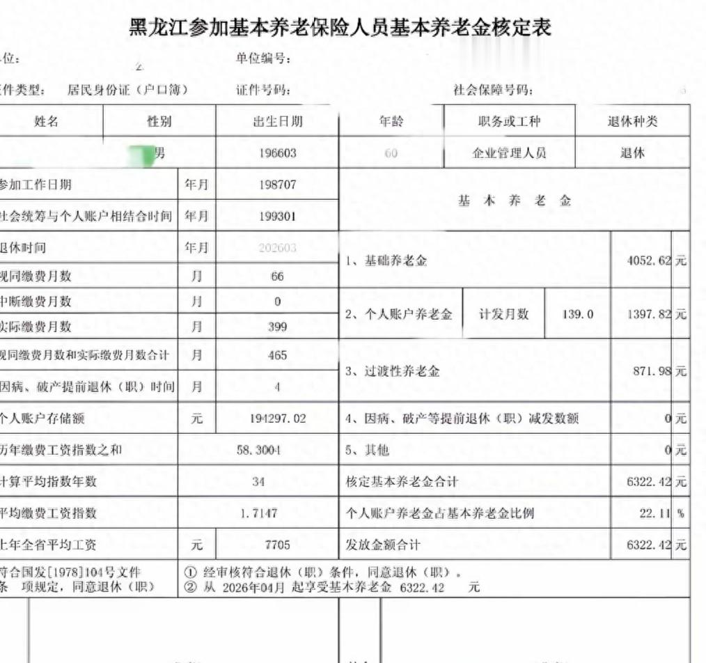 黑龙江是把上年度社平工资作为当年计发基数,而上年度社平工资是7705元,60岁退休计发月数是139,我们来算算这位友友的养老金。