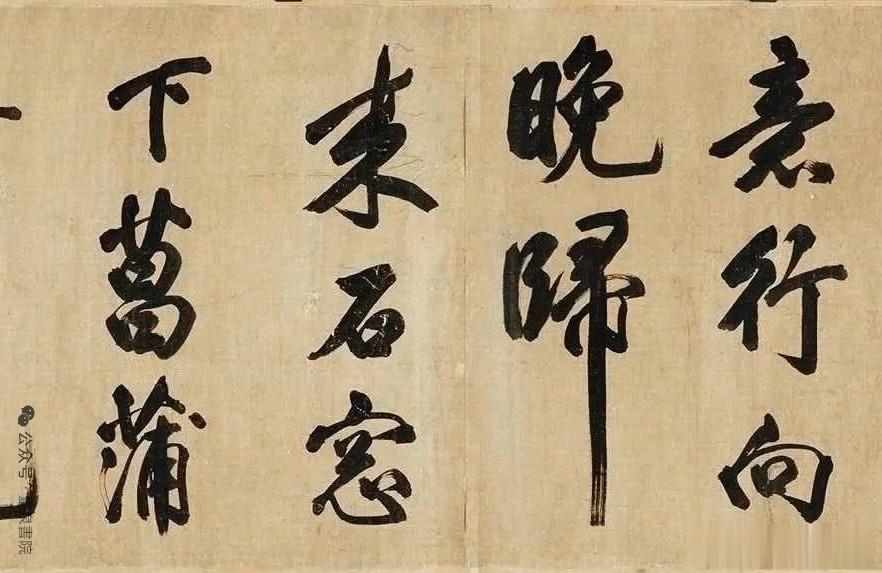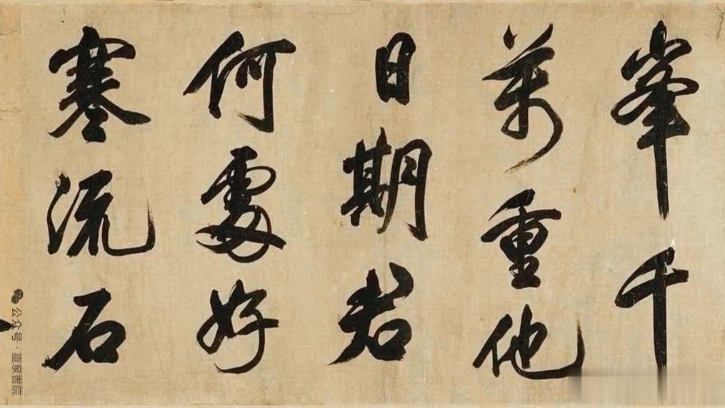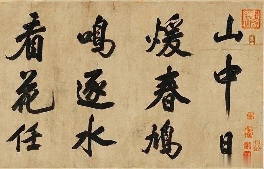 看这笔墨,才懂什么叫米芾“刷字”!八面出锋,提按如惊雷,“归”字一竖如长枪大戟,力透纸背;“花”字牵丝如游龙,欹侧中稳如泰山。每一笔都带着米芾的狂傲,结体险绝却气韵贯通,把“风樯阵马,沉着痛快”的米氏书风,刻进了每一道墨痕。