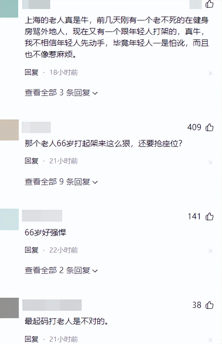 还有网友爆料称,上海的老人真是牛,前几天刚有一个在健身房骂外地人,现在又有一个跟年轻人打架的。