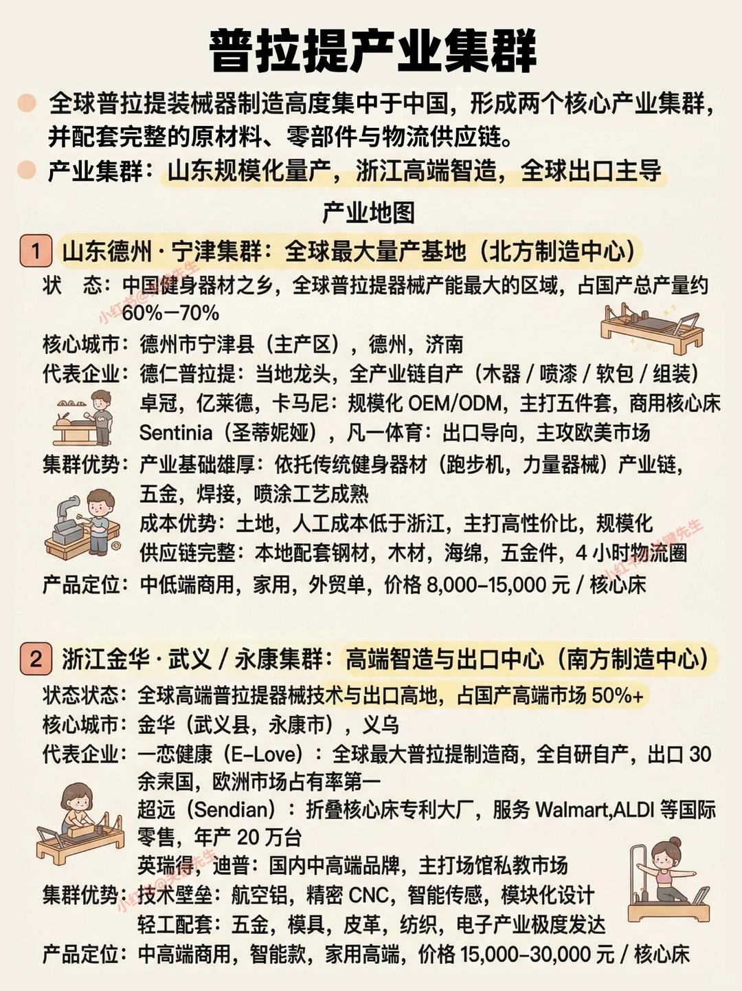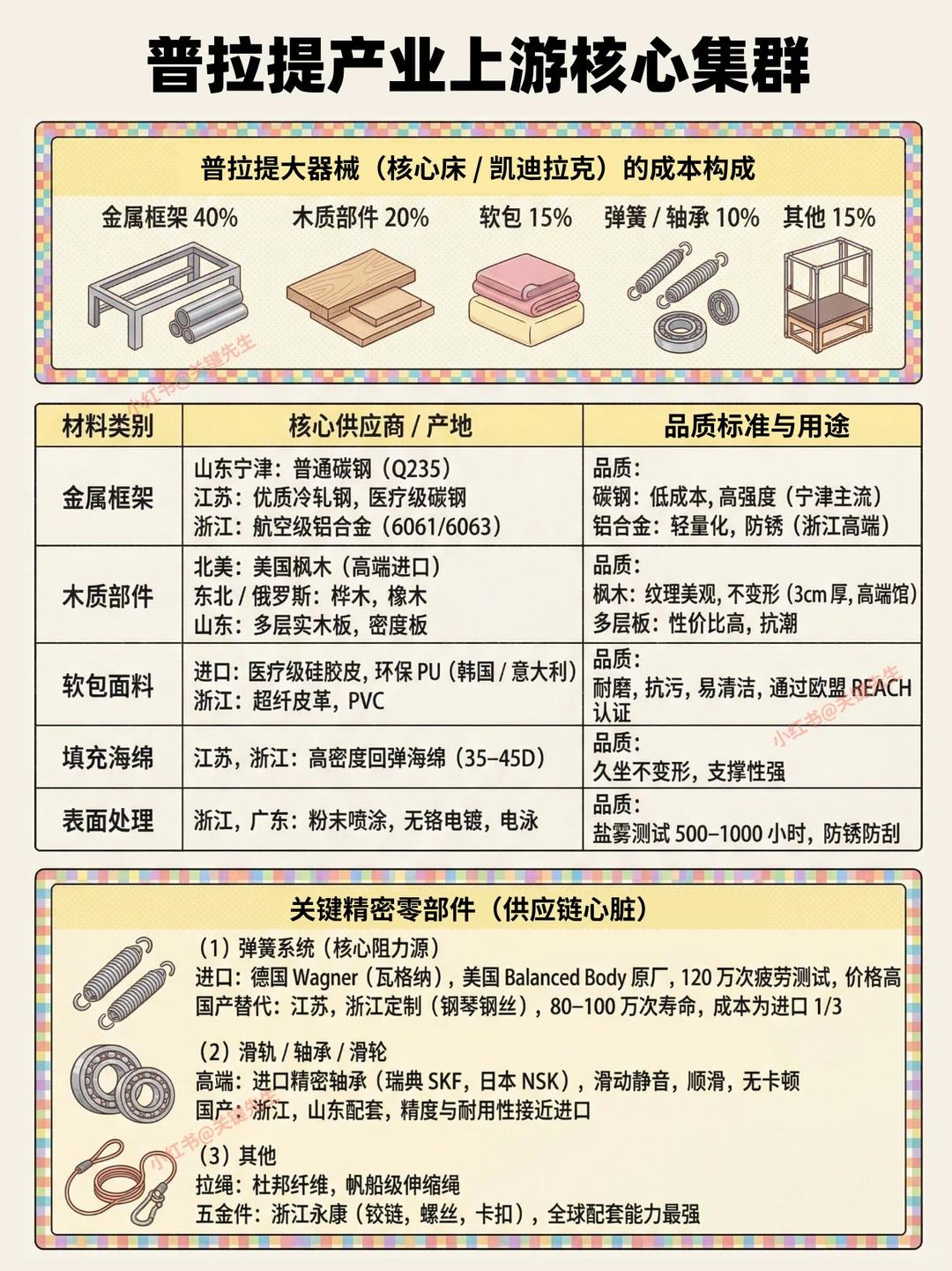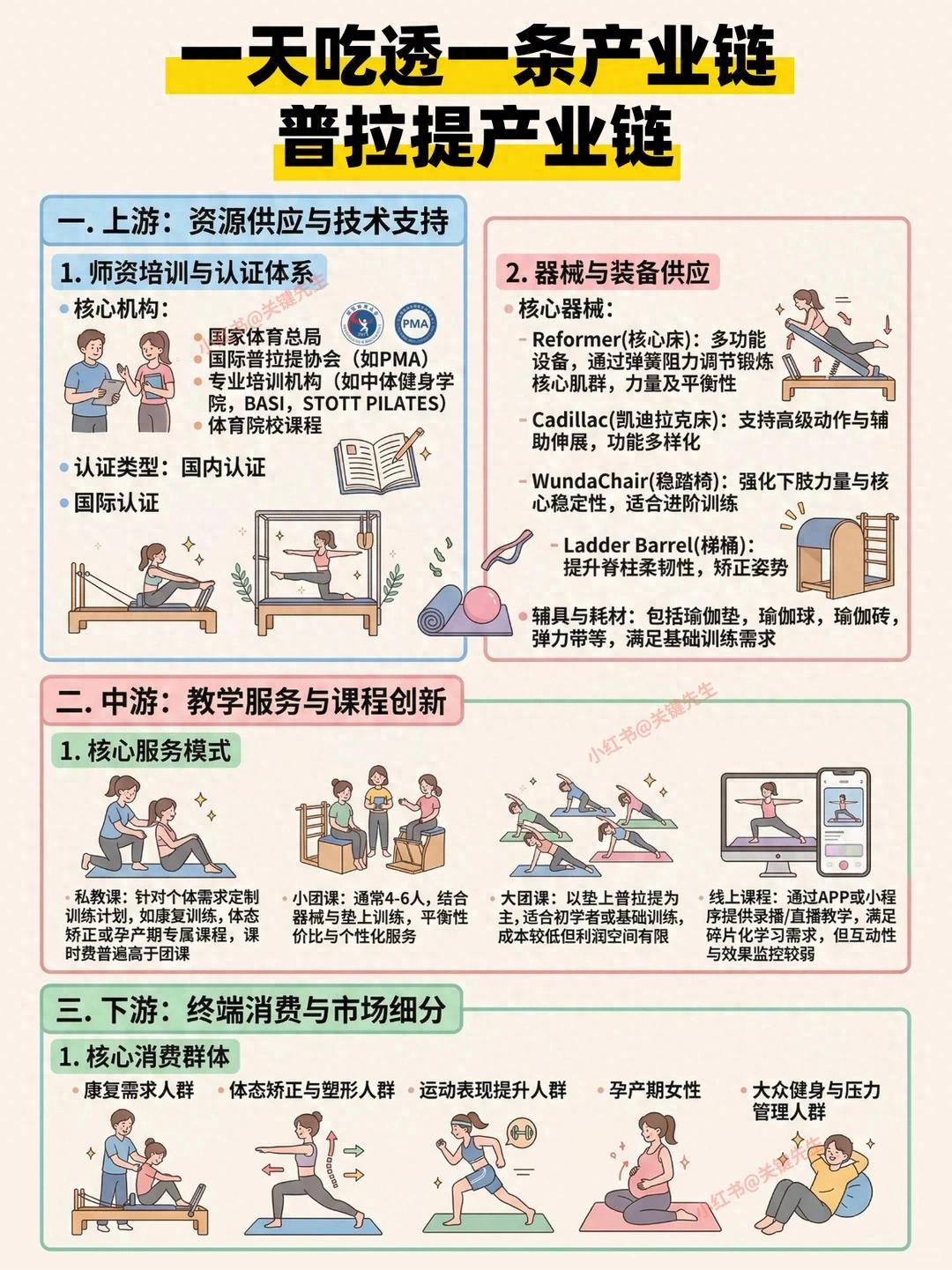 先说上游。教练认证是隐形暴利——一张国际证书培训费2-5万,毛利率超60%。器械也不差,进口一台普拉提床卖8-15万,成本主要是金属、弹簧和软包,山东宁津和浙江金华占了全球大半产能。国产替代虽然便宜,但高端市场仍被Balanced Body们把持。