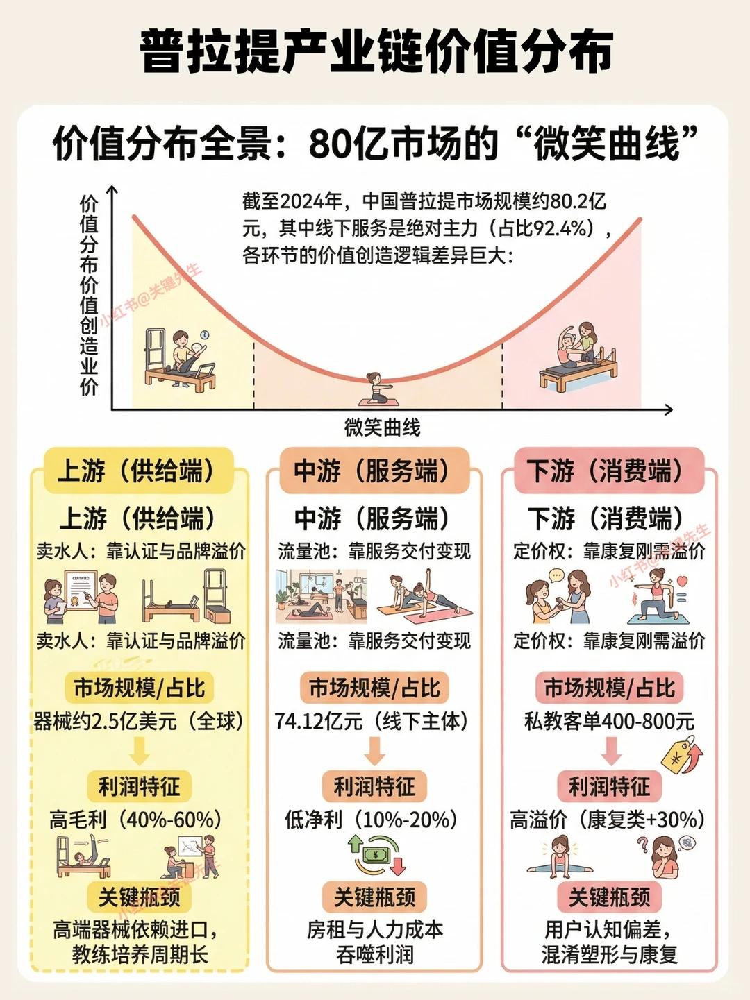 真正赚钱的是下游的康复需求——孕产和医疗康复客单价500-1000元,续费率58%,用户对价格不敏感。可惜大部分人只把普拉提当塑形,没意识到它的康复价值。