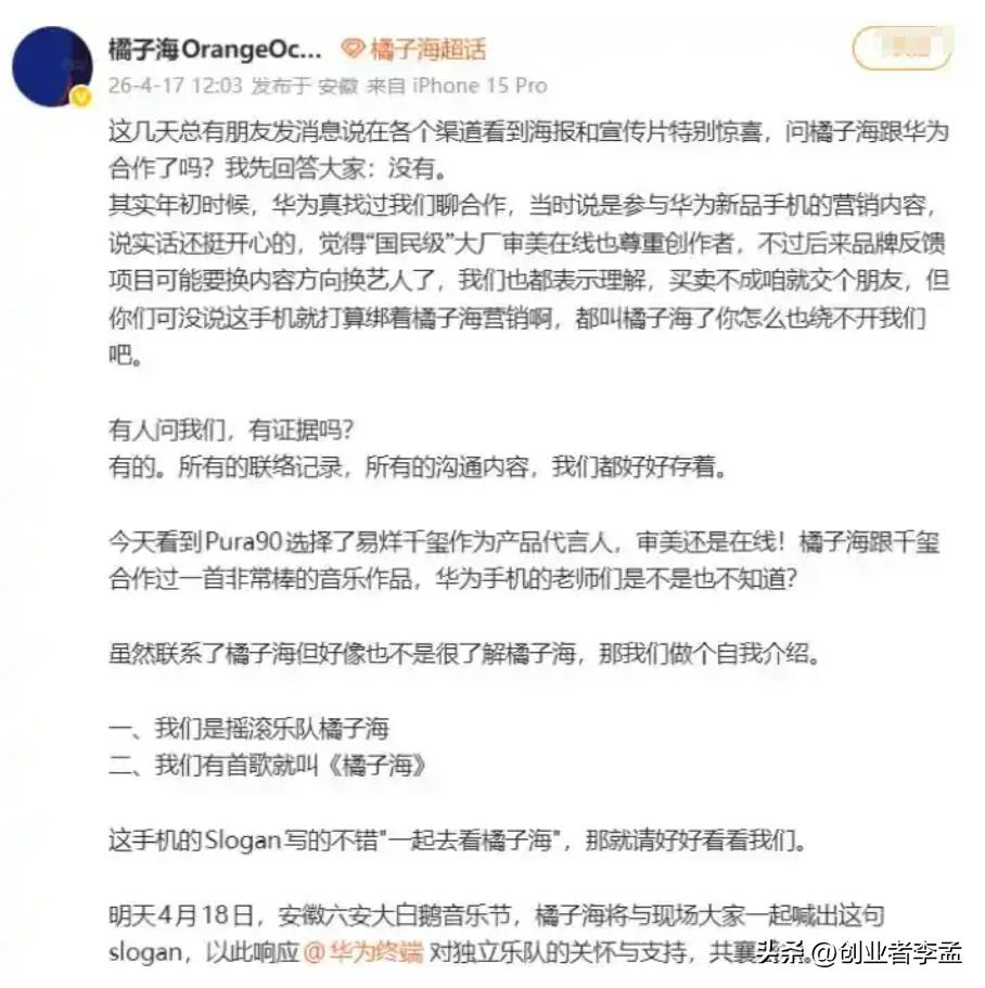 不过说实话,如果是他们展开合作了,这次华为pura90系列宣传用了橘子海乐队作为形象代言或者体验嘉宾,那并不是橘子海乐队帮助华为,而是华为帮助橘子海乐队扩大影响力。那既然没有合作成,反而用了橘子海这个词,他们内心肯定是不舒服的!