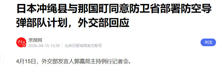 日本冲绳县与那国町同意防卫省部署防空导弹部队计划,外交部回应 京报网 2026-04-15 15:30 北京日报官网官方账号