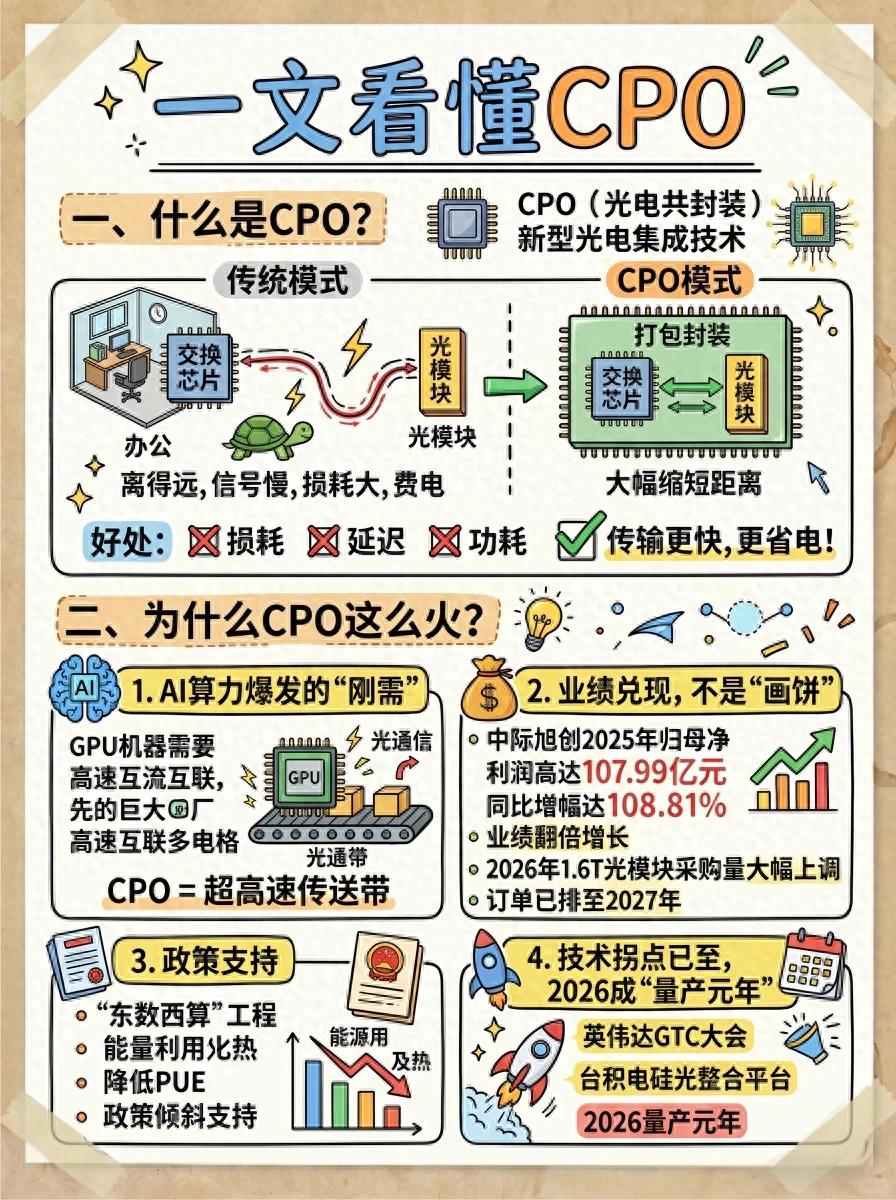 下游住房子的——就是英伟达、微软这些AI大厂。他们为啥抢着要CPO?因为传统铜线又慢又费电,CPO相当于给GPU拉了条“高速省电专线”。