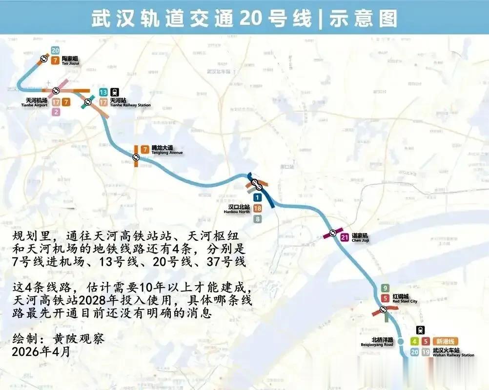 由于天河高铁站(天河枢纽)是武汉市今后最重大的交通工程,所以必须有一条地铁线连通,从线位来说,连接武汉新城-光谷-武昌-汉口-天河枢纽的13号线比20号线更好,但可惜的是,不知道是因为黄陂没钱,还是施工长度过长,13号线即使修建,也只建设第一期,从汉口火车站到光谷