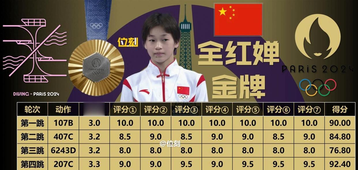 她7岁开始练跳水,14岁时在东京奥运会上拿了金牌,五跳中有三跳是满分,打破了纪录。那时大家叫她“水花消失术”,因为她的动作干净利落,入水几乎没有水花。后来她在巴黎奥运会上又拿了一块金牌,成为中国最年轻的三金得主。