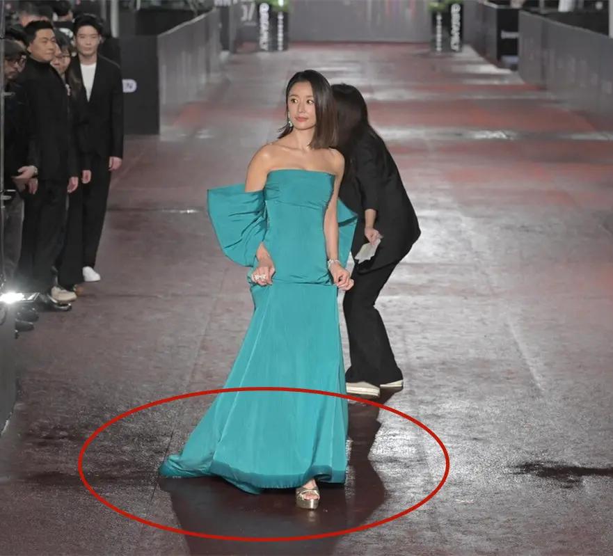 - 红毯进行半小时:裙摆率先被雨水打湿,变为浅橙色
