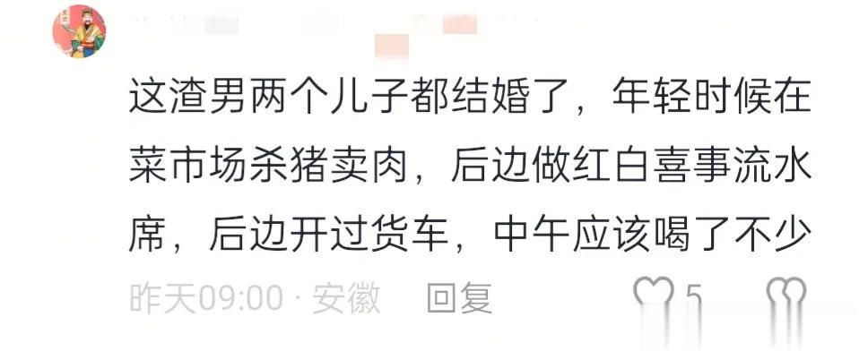年轻的时候是杀猪的,后来做农村流水席,还开过货车,喜欢喝酒。