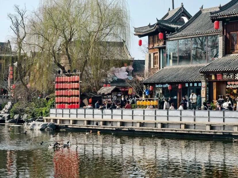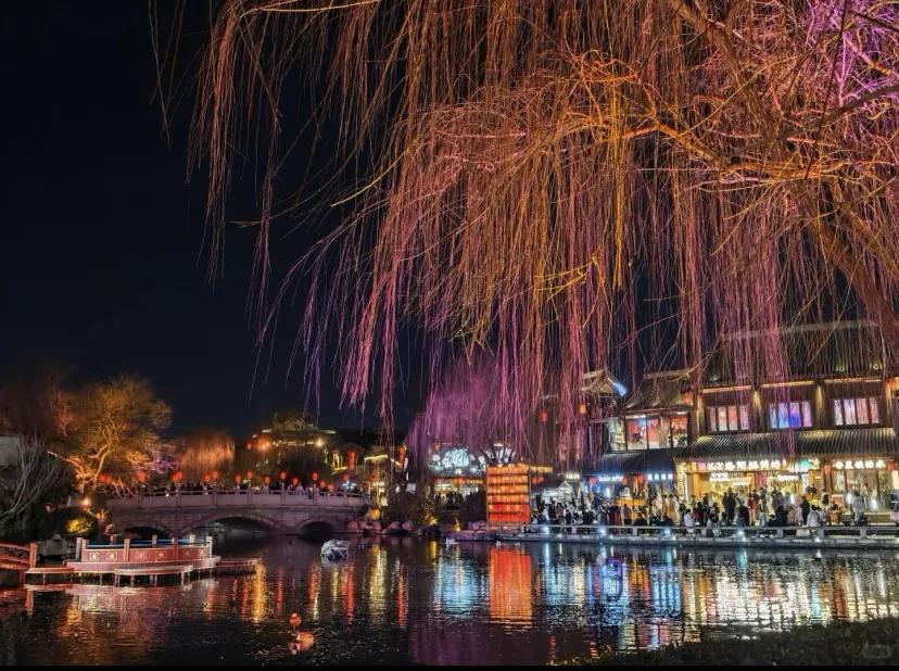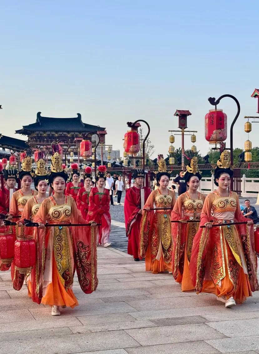 沉浸式体验汉唐风情:洛邑古城以清初重建的文峰塔为核心,复刻明清洛阳古城的街巷格局,免费开放(牡丹文化节期间售票),目前是是全国汉服密度最高的街区。红灯笼映着青石板路,非遗作坊、古风演艺、灯光水秀齐聚,入夜后宛如盛唐画卷。糖画、面人、剪纸、皮影、汉服妆造等体验丰富,随处可见唐装仕女与书生,随手一拍都是古风大片。塔影婆娑、乐声悠扬,穿越感拉满,是夜游洛阳必打卡地。