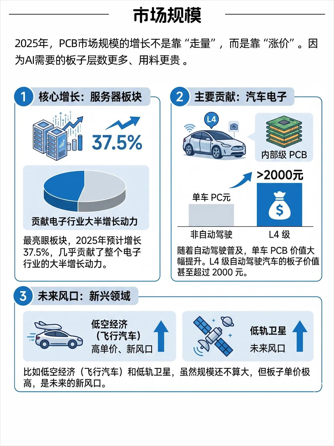 2025年全球PCB市场预计增长12.8%,其中服务器板块直接飙了37.5%,几乎撑起了整个行业的增长。L4自动驾驶单车板子价值超2000元,低空经济、低轨卫星这些新风口单价更高。