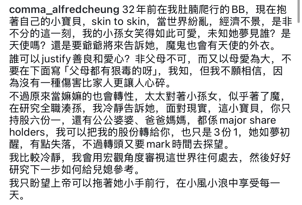 张坚庭的这个孙女是他的32岁长子张高铭所生,看到儿子成为父亲,他又不禁感慨称没想到32年前还在自己的肚腩上爬行的孩子,如今已经抱着自己的小宝贝了,时间真是过得飞快。张坚庭的长子张高铭在2022年低调结婚,他毕业于美国纽约大学,修读的是电影和政治,或许是从前受到了父亲是导演的影响,张高铭对电影艺术颇有兴趣,所以修读了相关的专业。2017年他曾经与张坚庭一起执导微电影,之后开始独自执导纪录片。2022年张高铭在美国硕士毕业,同年底就娶了相恋多年的女友,结婚四年后生下了女儿。