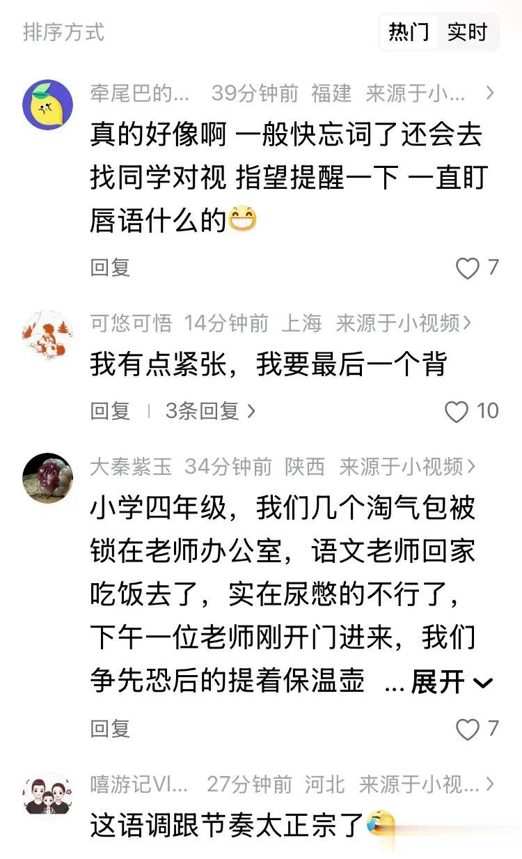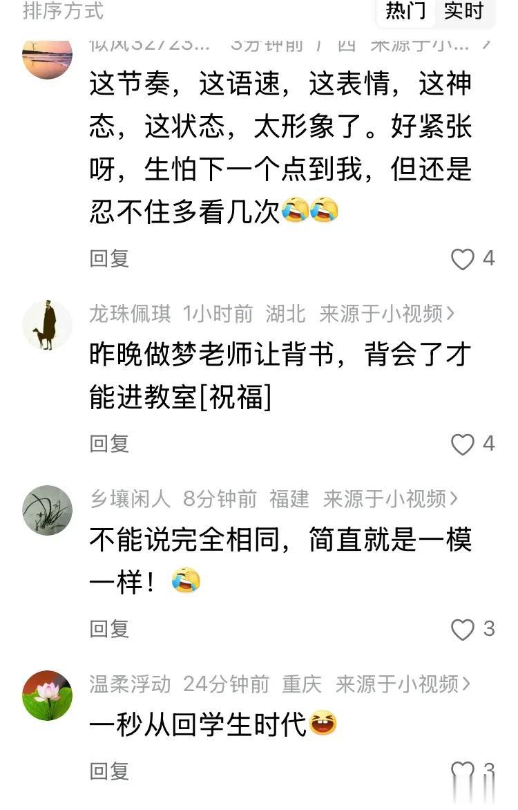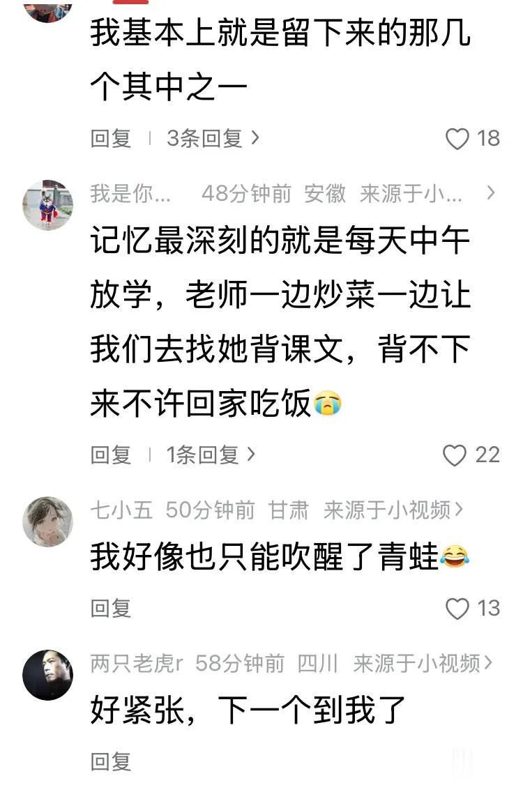 这种刻在骨子里的紧张,成了评论区里的共同话题。“我有点紧张,我要最后一个背”“完了,完了!下一个到我了?”“别叫我,别叫我,看不见我,看不见我”,这些留言像极了当年课堂上,坐在座位上缩成一团、祈祷老师不要点到自己的我们。有人甚至说“一秒从回学生时代”,连梦里都在被老师叫起来背书,背不出来就进不了教室,那种手心冒汗的焦虑,时隔多年依然清晰。