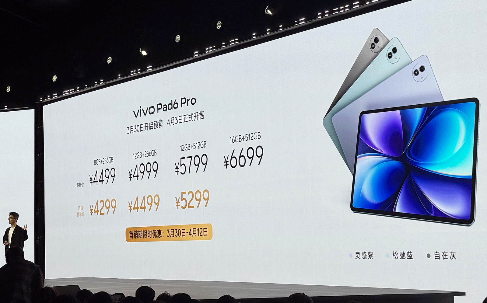 在此次vivo发布会蓝厂还推出vivo X300s和vivo Pad6 Pro,前者是“超能小V单”,售价4999元起,整体配置处于X300与X300 Pro之间;后者是一款采用旗舰芯片的4K大平板,屏幕尺寸达到13.2英寸,首销优惠价4299元起。