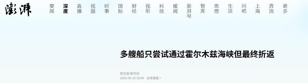 此前,伊朗外长阿拉格齐在黎巴嫩与以色列停火期间曾宣布,将对所有商船开放霍尔木兹海峡。但伊朗媒体18日的报道显示,由于美国“屡次违背承诺”,伊朗军方已重新收紧管控,霍尔木兹海峡对实际通行船只依然存在威胁。