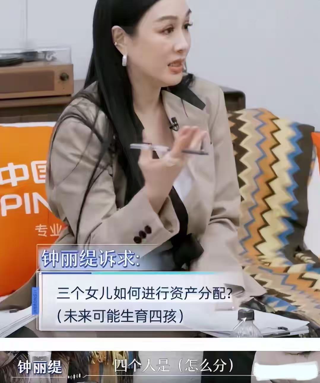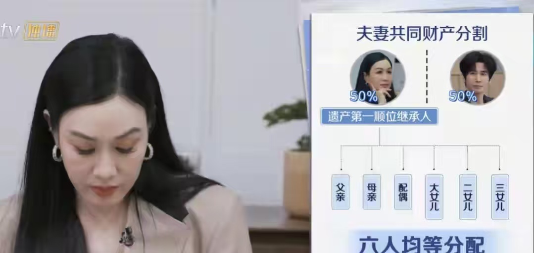 只是看了这张分配图,觉得成了笑话。夫妻共同财产钟丽缇和张伦硕一人一半,钟丽缇如果不在了,属于她的财产就分成六分留给她的父母和三个女儿就算了,另外还要从其中留一份给张伦硕,这不是笑话吗?