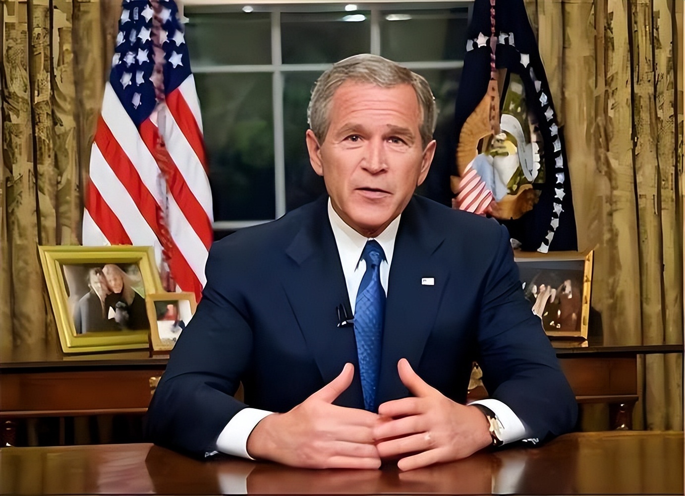 结果9・11事件突然爆发,纽约双子塔轰然倒塌,近三千人遇难,小布什瞬间调转枪口,喊出“要么跟我们站在一起,要么跟恐怖分子站在一起”,全副精力砸向中东。