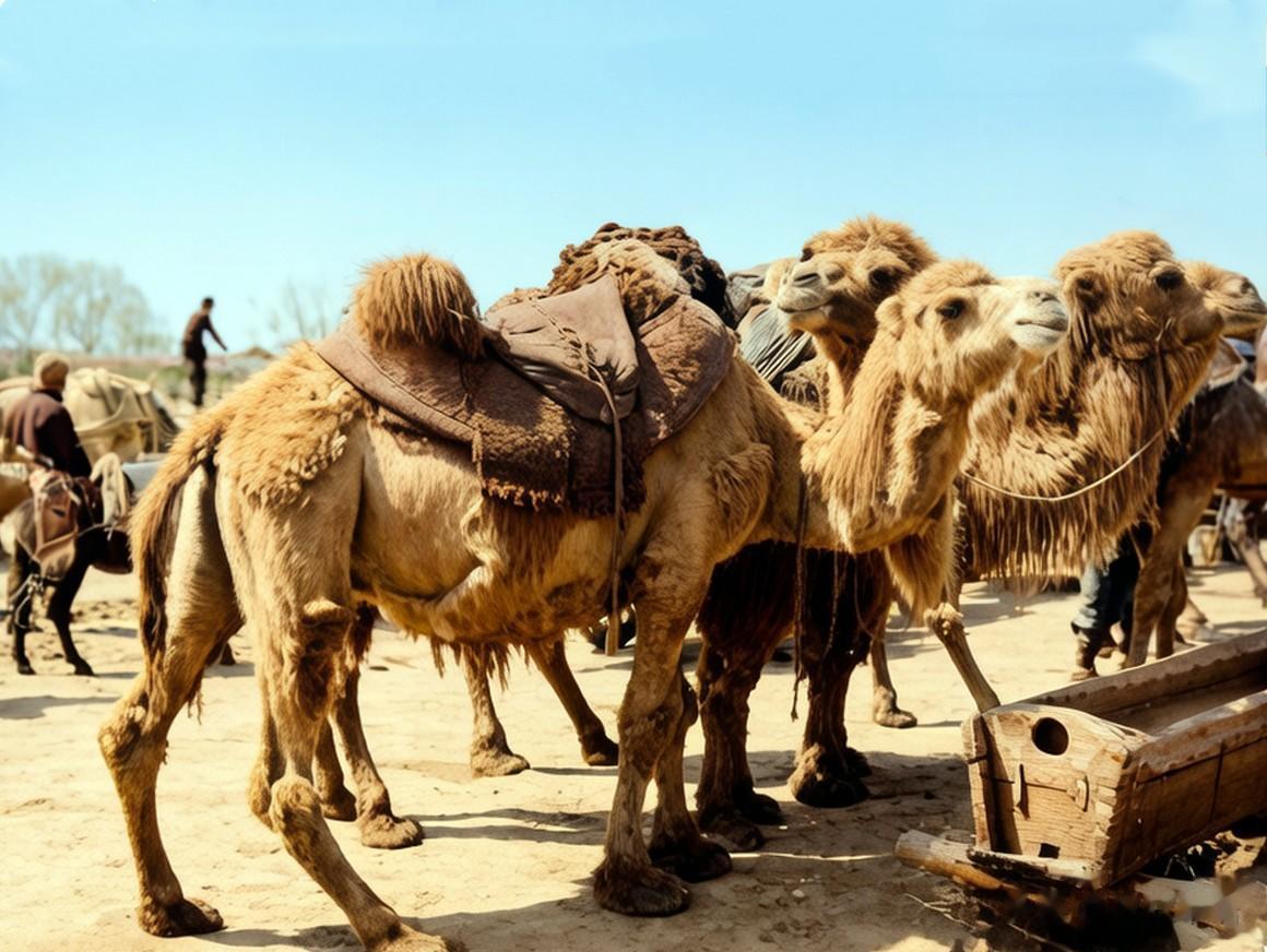 路边休息的骆驼商队。虽然此时的灵石境内早已通了火车,但古老的骆驼依然担负着山区和短途运输工作。