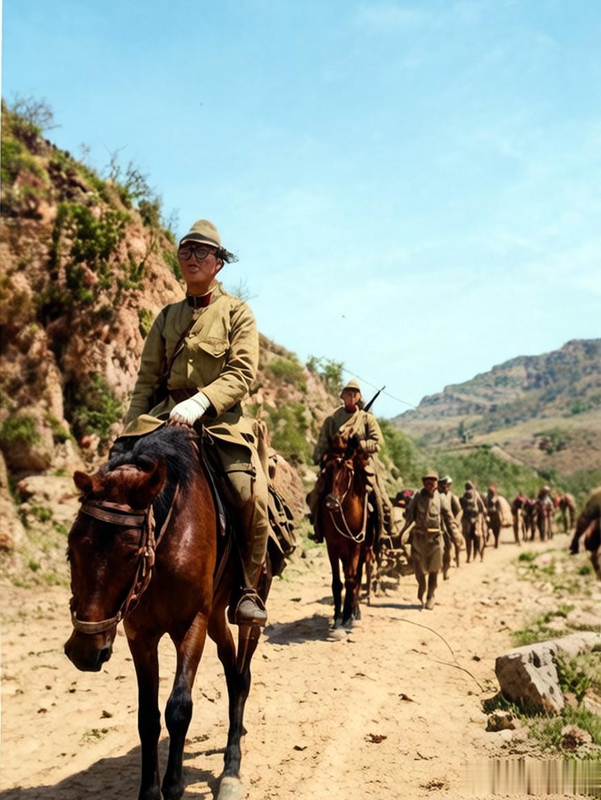 这是一支在山间行进的日军辎重部队,戴着白手套的日本军官得意洋洋地走在前面,后面有背着长枪的骑兵和步兵跟随。