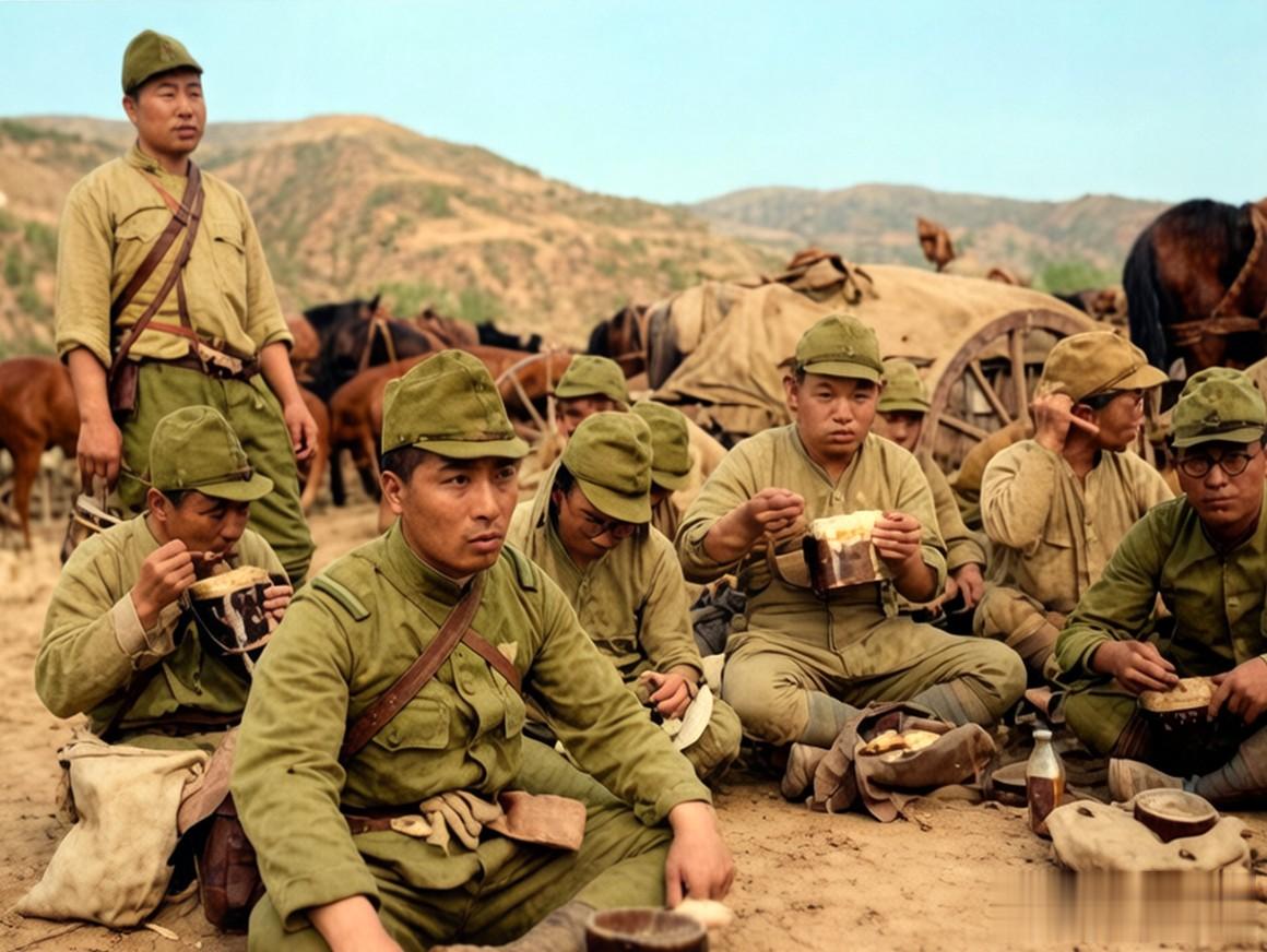 途中休息的日本士兵,坐在路边正端着饭盒吃饭。日本人所使用的饭盒是铝制的,因其独特的椭圆形向内弯曲的造型,被中国老百姓形象地称为“猪腰子饭盒”。