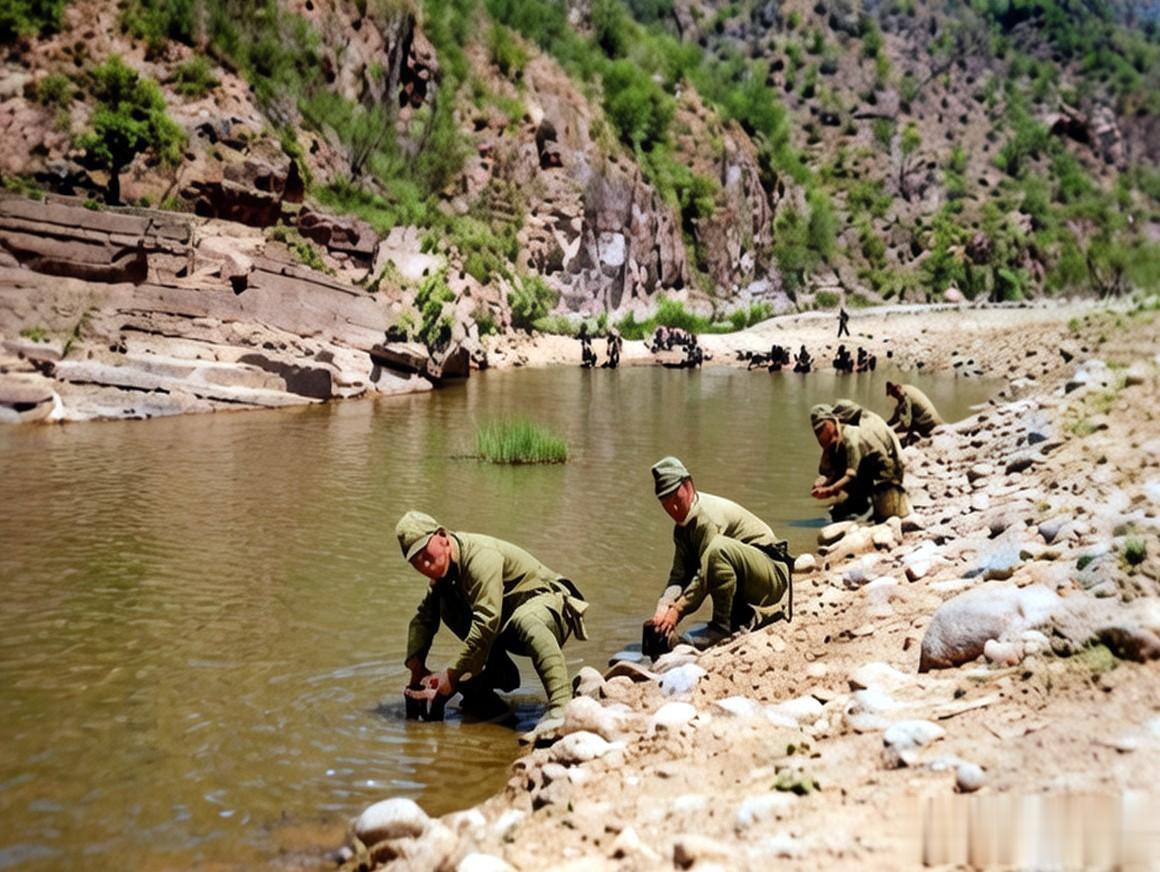 吃完饭后,在路边溪水中洗饭盒的日本兵。日军的饭盒分盒盖、外盒和内盒三部分组成。可以直接放在火上加热,设计得非常巧妙。