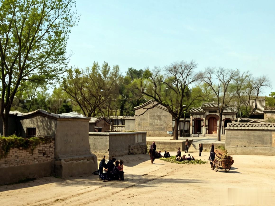 斑驳的古城墙掩映在绿树丛中,若隐还若现。城墙下是一座三座门的寺庙建筑,周围的布满了民居房屋。民居旁边是一块空地,有不少当地百姓活动的身影。