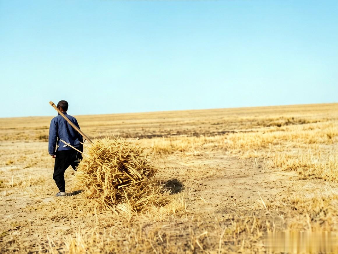 腰间系着布带在田里收集干草的农夫。成熟的庄稼已经收割完毕,地里落下的干草也不能浪费,收集起来可以作为牲口的饲料,也可以用来烧火。
