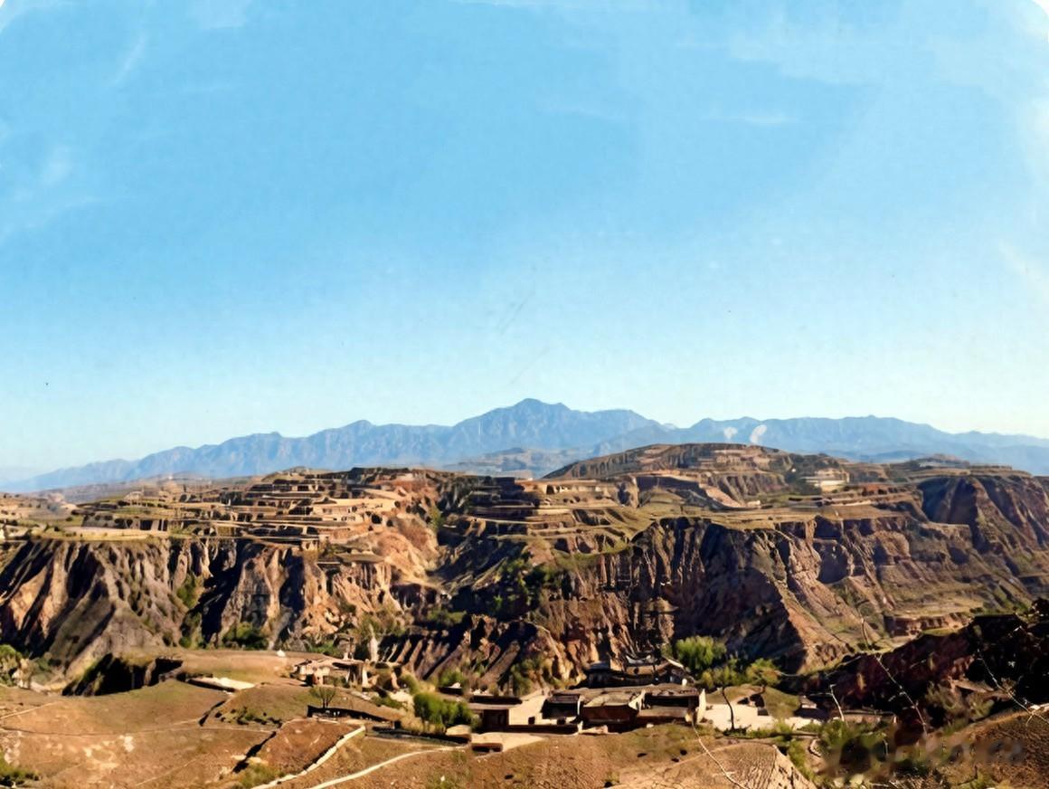 1938年9月,日本人拍摄的介休与灵石之间的山野风貌,黄土高原上下零星地散落着一些民居建筑,远处群山连绵,非常壮观。