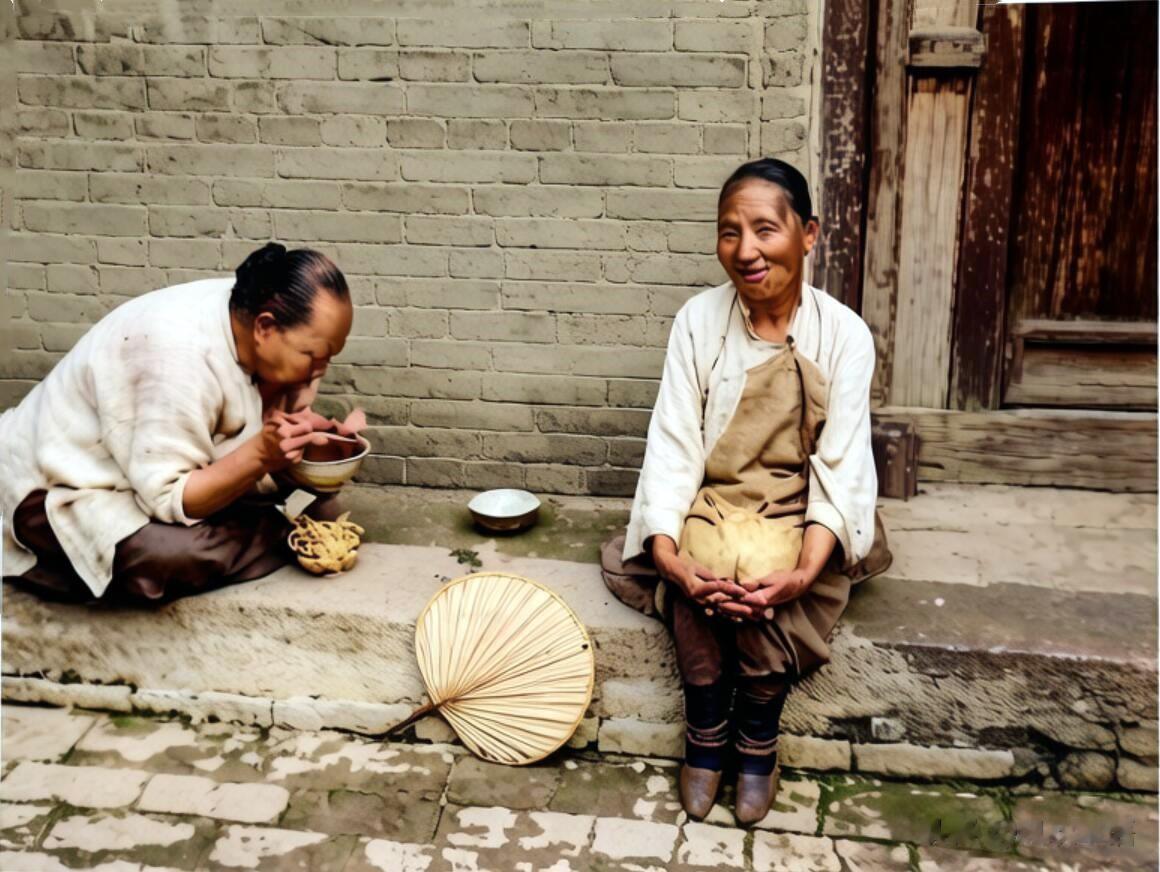 灵石城内街边的两个妇人坐在门前的台阶上,一个盘腿正在埋头吃饭,另一个抱着双膝看着镜头。腿边还摆着一把芭蕉扇。年纪大经历的灾难多了,对眼前的鬼子兵也早已见怪不怪。