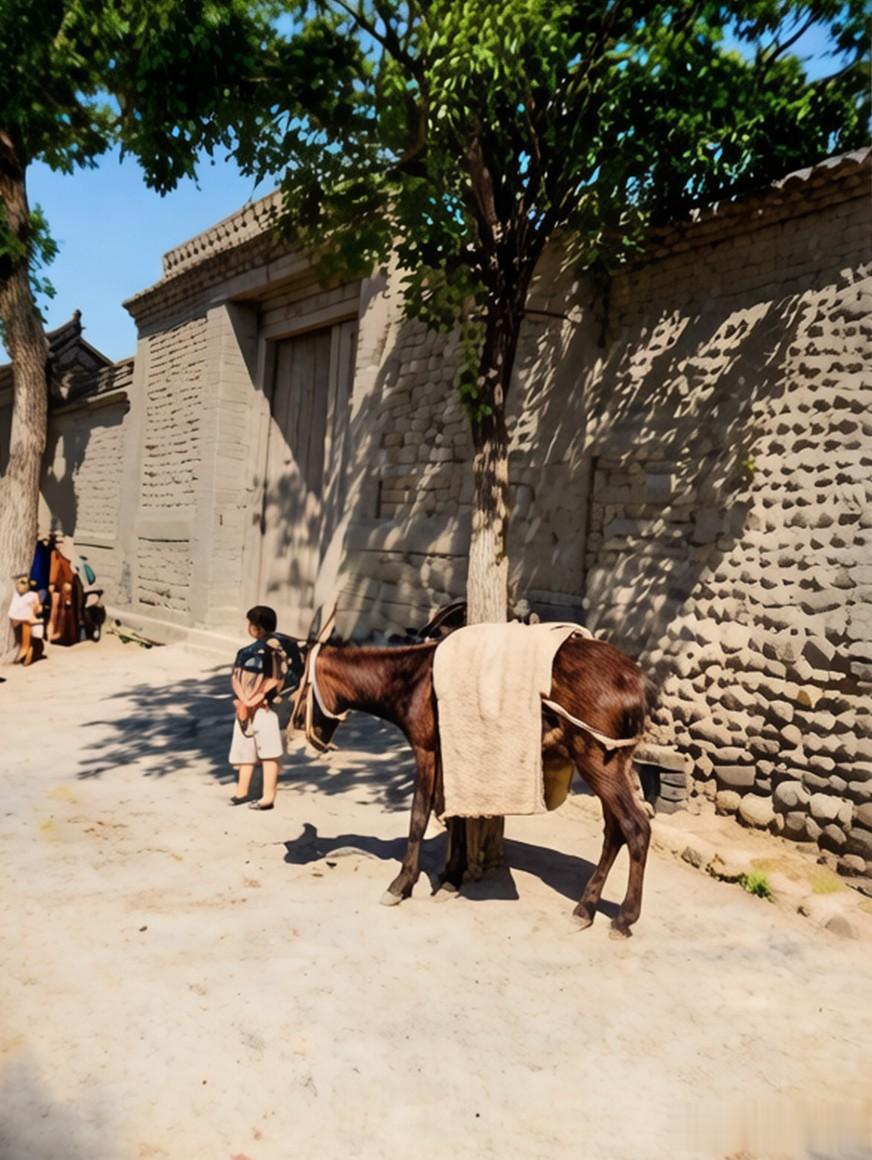 灵石一户人家门前景象,高大的门楼,墙壁是用石头垒砌的。大门两旁的老树和斑驳的墙壁说明这座院落已经有些历史了。一头毛驴安静地站在树下,旁边是一个穿着短裤的小孩子。