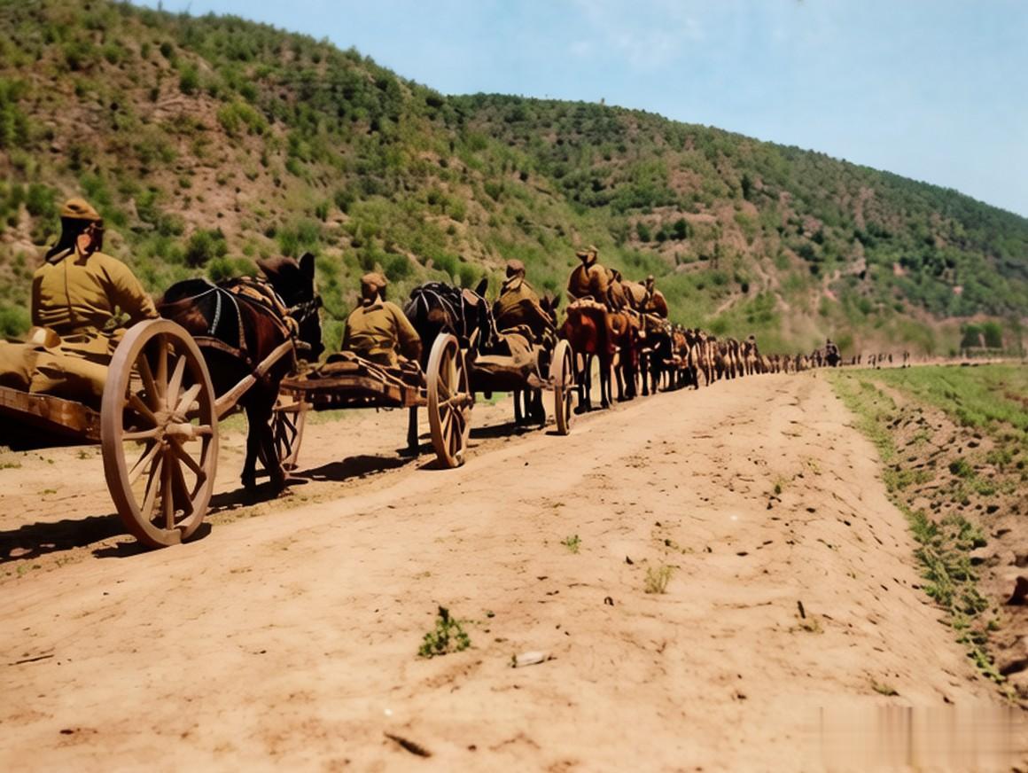 从后方看这支辎重部队,武装打头的鬼子兵后面是一溜马车,每辆车上都坐着一个驾车的鬼子。