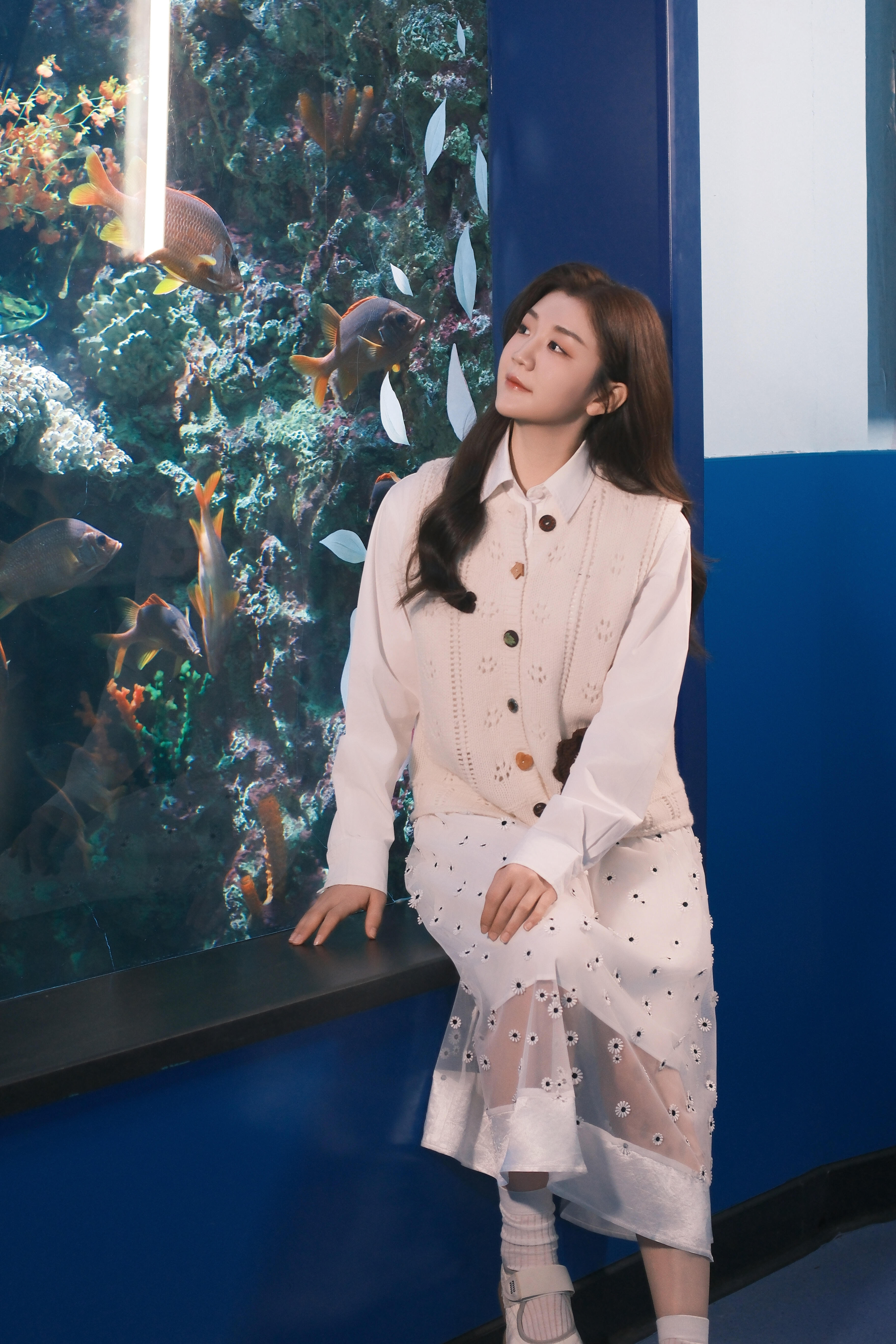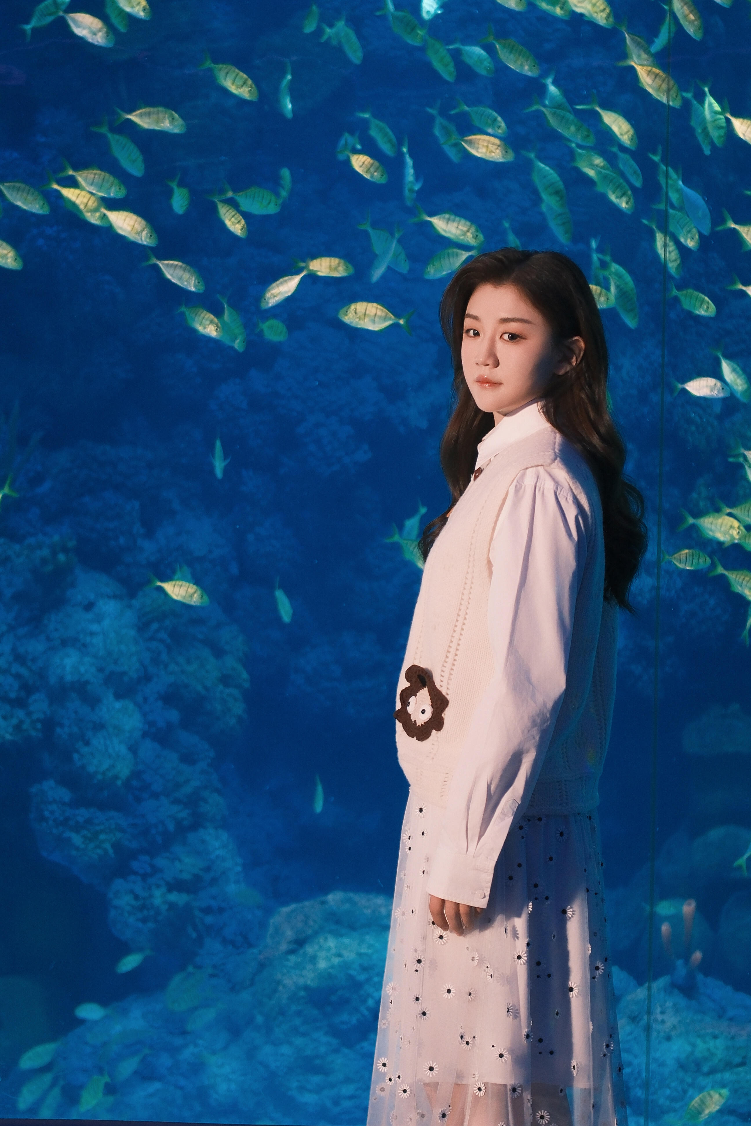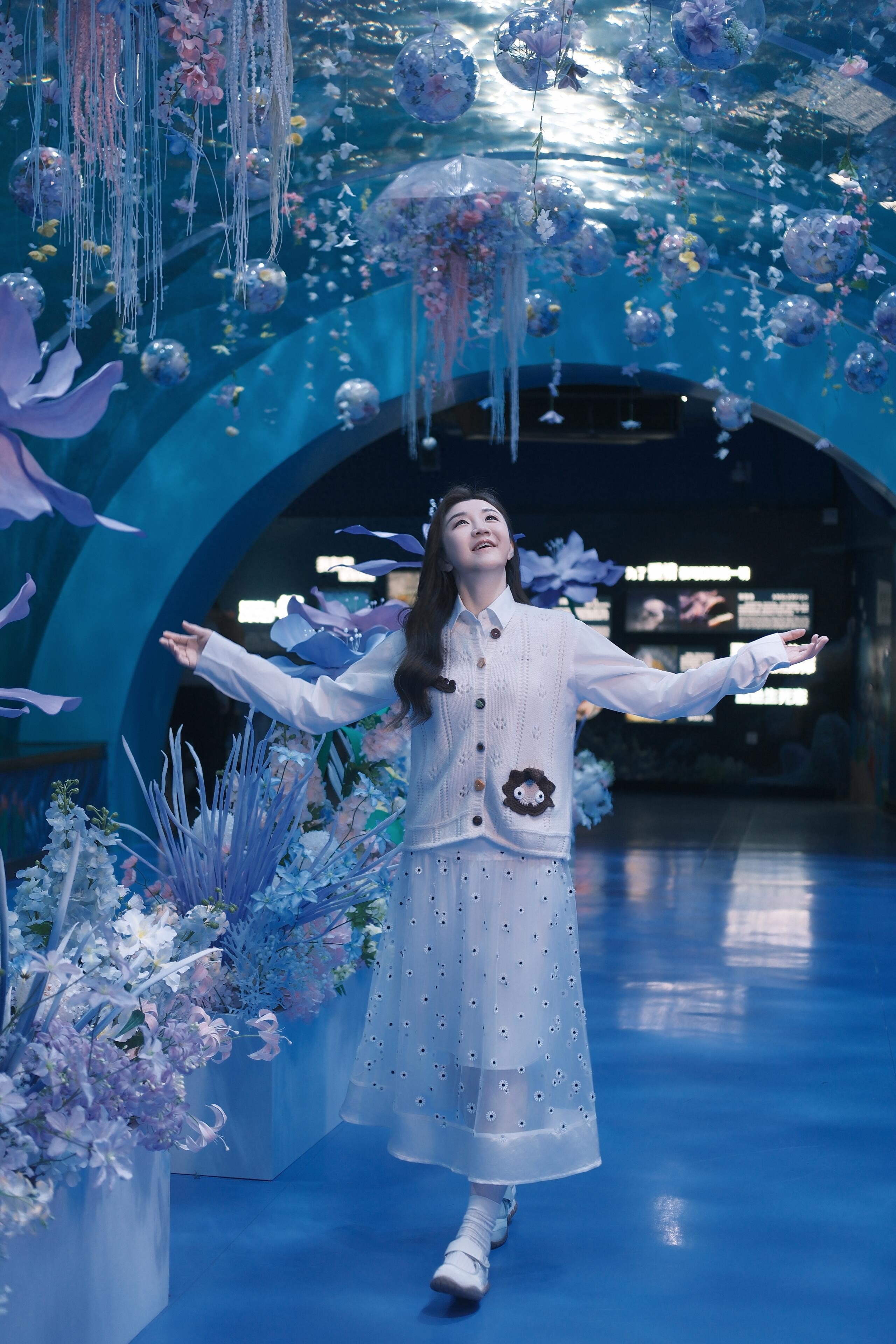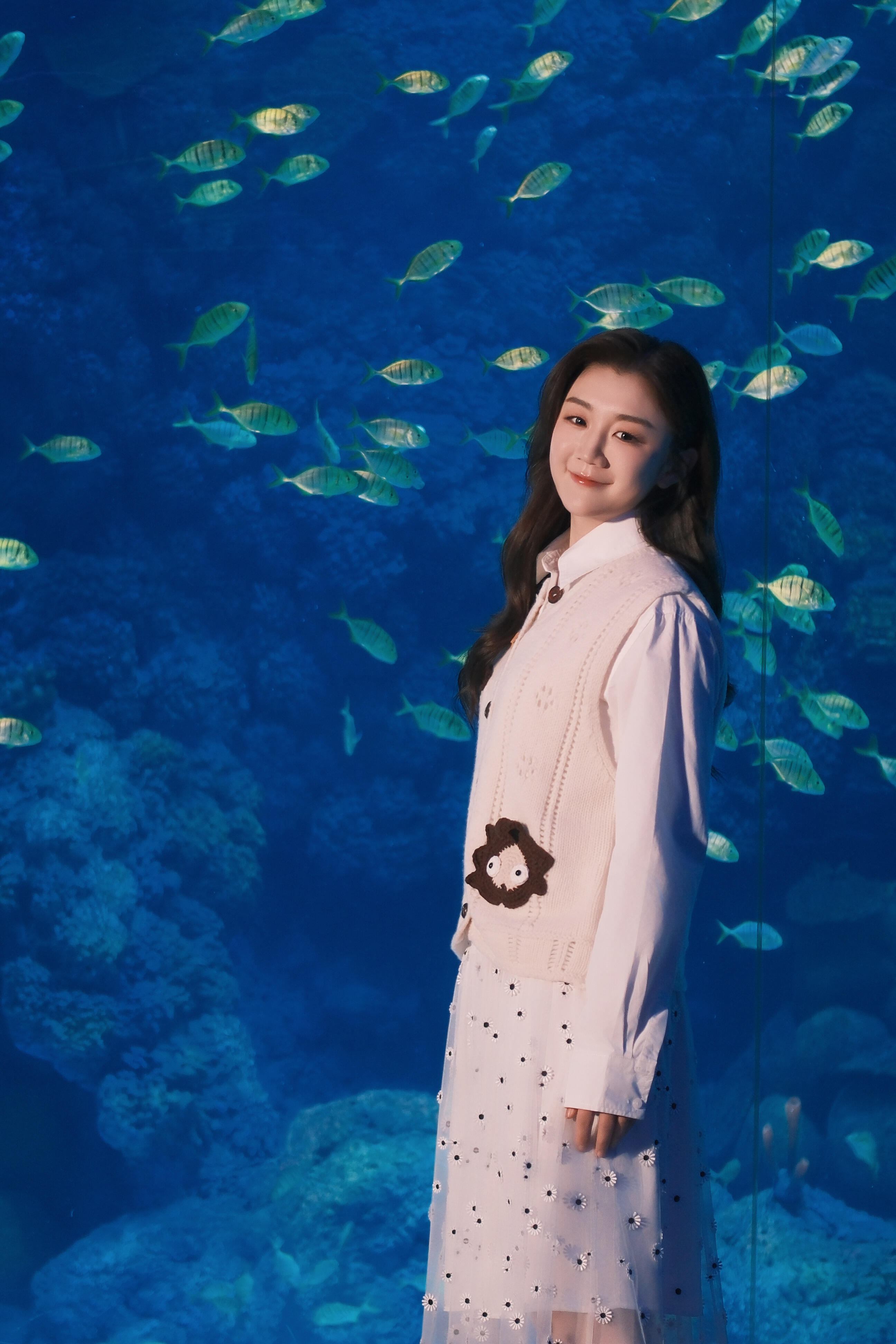 海洋馆偶遇奥运冠军陈梦,她穿着透视波点裙,长卷发温柔美丽大方