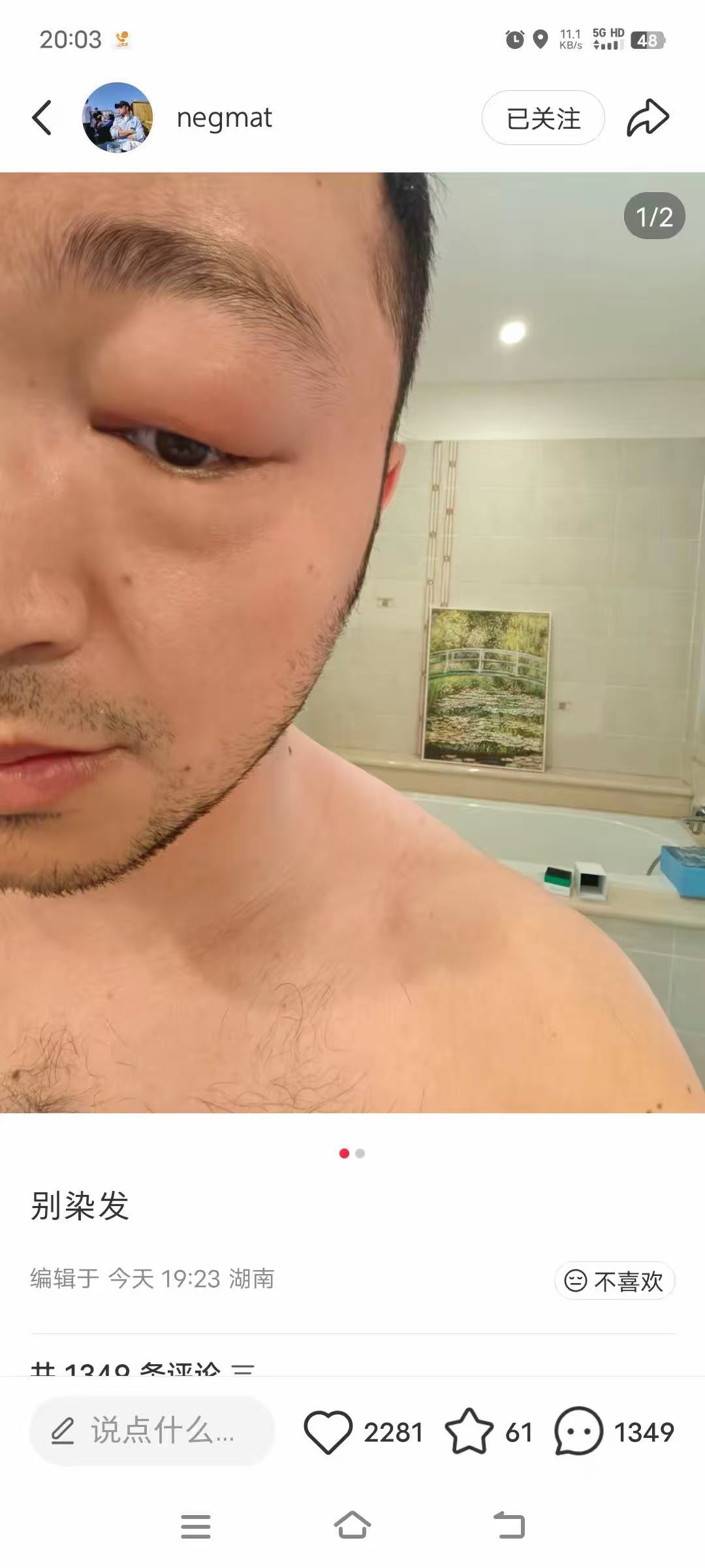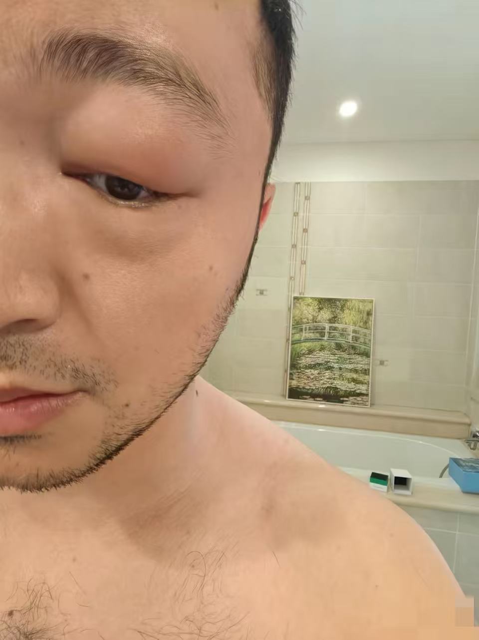 尼格买提在社交账号上只发了三个字的文案,呼吁大家别染发。他一发完照片,就立马有一千多条评论,大家都在问他怎么了,是不是被人打了。尼格买提说是自己在家里染发,不小心弄到了眼睛里,导致眼睛过敏。他身后的浴缸上还放着染发膏,头发这么黑,没想42岁的他也需要染发。