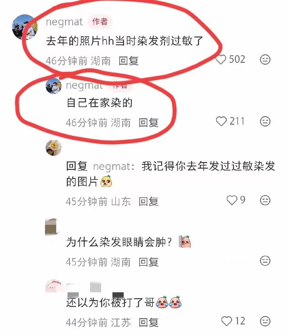 看到很多粉丝都对自己眼睛很关心,尼格买提在评论区公开了原因。原来这是他去年的事,现在发是因为想提醒网友别乱染发。自己在家一个人染,工具不正规不说,还没人帮忙,有需要还是应该去正规的理发店染。经过这次,尼格买提也牢记心中了,闹了个乌龙好在没大碍,春晚我们还能看到他帅气的脸蛋。