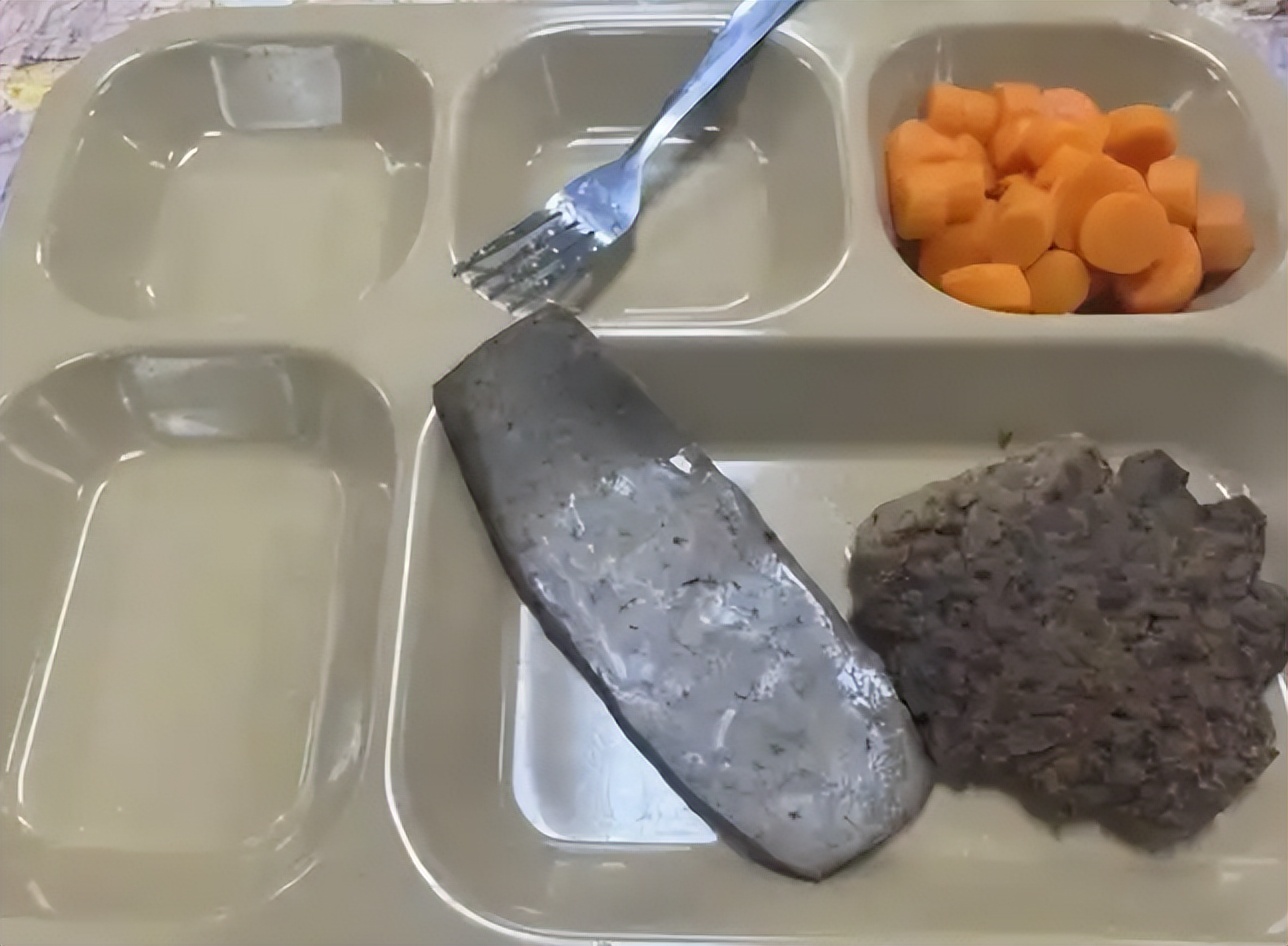 印象里美军的伙食,不说顿顿牛排、龙虾、无限供应的炸鸡,也得是营养均衡、管饱管够,结果照片里的餐盘,只有一小勺干巴巴的水煮胡萝卜、一坨毫无油水的碎肉,还有一张被水兵们吐槽像“鞋底子”的灰色不明加工肉块。